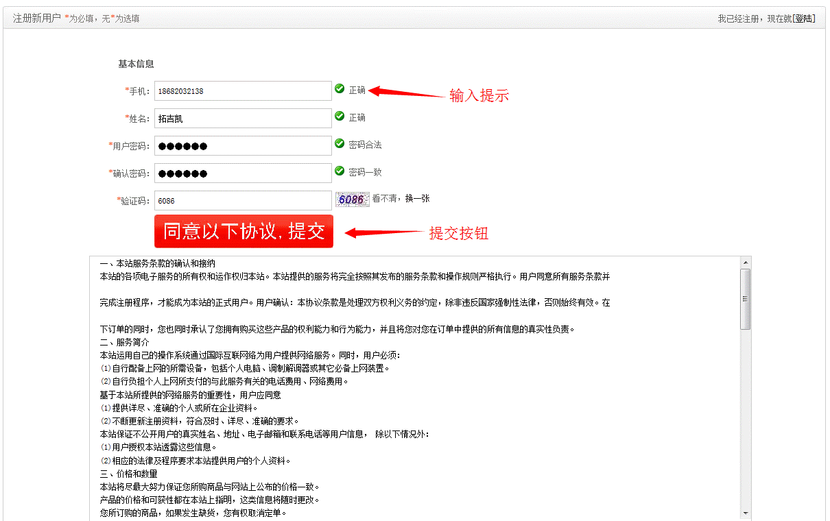 点击注册链接,跳转到注册资料录入页面。在这个页面输入您的手机号码,姓名,密码和系统验证码,每个输入项系统都会进行校验,如果输入不合法,系统会在输入项右侧给出输入错误原因提示。如果输入正确,右侧会显示绿色背景的小钩。在所有输入项都正确输入后,点击最下方的提交按钮即可完成注册。如下图: